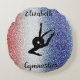 Gimnasia Personalizada de almohada redonda roja azul. ¡Tiene un aspecto brillante y brillante sin el purpurina real, así que no hay lío ni irritación! Hermosas siluetas de gimnasta en ambos lados y lo mejor de todo es que puedes personalizar esta almohada patriótica con el nombre de tu gimnasta.