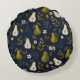 The pattern on this round pillow showcases beautifully hand-painted watercolor pears in lush green tones, surrounded by flowing leaves and subtle floral details. The deep navy background enhances the vibrancy of the artwork, creating a sophisticated botanical design that feels both organic and timeless.