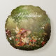 Una linda hada con un gorra de setas rojas habla con una pequeña mariposa mientras se sienta en silencio sobre un tronco en el bosque. Está rodeada de hongos rojos y blancos y de margaritas blancas.