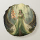 Una hermosa hada con un vestido verde claro y fluido y joyas hechas de peridotos con piedras de peripunto en su largo cabello verde claro y translúcido, alas de libélula con un gladiolo camina por un mágico bosque rodeado de flores rosas y azules y árboles cubiertos de viñas.