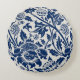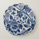 Intricate blue floral pattern on a light background, featuring stylized blooms and curling leaves, evoking a vintage, elegant feel.