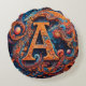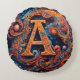 La Carta A Cushion redonda se enmarca en un fondo salvaje y colorido de rojos y naranjas con un respaldo azul.