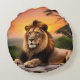 Hermoso león sobre una roca con la puesta de sol de la jungla detrás