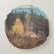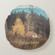 Fotografía paisajística. Tarde en otoño, cabaña solitaria en el bosque, montañas en el fondo, flores silvestres en primer plano. Escena de Moody para todos los admiradores de la vida silvestre, viajeros, soñadores, buscadores de aventuras y amantes del estilo rural. Por favor, personalice esta almohada redonda añadiendo su propio mensaje. Para más modificaciones (estilo de fuente, color de fuente, posición de texto), haga clic en "Editar diseño".