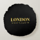 El diseño de la almohada redonda de lujo con acento presenta las coordenadas del mapa de latitud y longitud de Londres, Inglaterra en fuentes doradas.