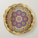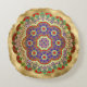 Elegante acento redondo arroja almohada de tono dorado, con una mandala dorada y colorida, en el medio.