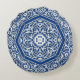 Almohada redonda en un patrón de medallón adaptado a la antigua teja persa - tracería blanca sobre el azul cobalto
