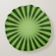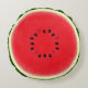 El frente de esta almohada es una jugosa sandía mitad con corteza, semillas y agujeros de semillas. La parte posterior muestra que la piel a rayas se desvanece hasta un punto de campo pálido.