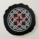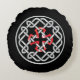 Una almohada redonda con un diseño de nudo celta con una cruz cuadrada roja en el centro.