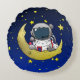 Moon Adventure Reversible Round Pillow - Un lado muestra un astronauta posando desde una luna creciente, con estrellas a su alrededor, sobre un fondo de cielos estrellados. El otro lado muestra Saturno, un barco espacial que va a Saturno y una estrella. Una almohada divertida y reversible que sería ideal para una cama de astronauta, sobre todo cuando se combina con una funda del Duvet Moon Adventure.
