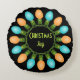Esta almohada redonda de texto fácil de personalizar también cuenta con un gráfico de Navidades coloridos que representa un círculo de bombillas festivas en azul y naranja.