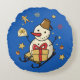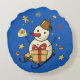 Un lindo muñeco de nieve en un trineo con un regalo, una letra pequeña y decoraciones navideñas.