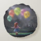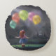 Una linda niñita con una camisa rosa y una falda azul sostiene cinco globos de colores. Ella está trayendo un manto de brillo a un mundo oscuro. A lo lejos se encuentra un edificio gris rodeado de brumas, árboles oscuros y montañas.