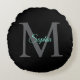 Cojín Redondo Nombre de guión teal, monograma gris grande sobre