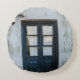 COJÍN REDONDO PANEL DE PUERTA DE MADERA AZUL EN EDIFICIO BLANCO