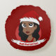 almohada redonda con un ilustracion de una hermosa joven afroamericana con cabello ondulado y el gorra de Santa Claus; con plantilla de texto editable, diseño de vacaciones Navidades con fondo rojo