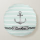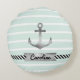 Moderna almohada de tiro redondo con ancla de color gris sobre un fondo de rayas verdes y blancas de menta. También puede personalizar el diseño con texto personalizado bajo el anclaje.