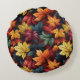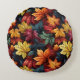 Esta almohada de acento de forma redonda se muestra en una hermosa y colorida hoja de otoño impresa.