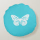 Esta almohada verde azulada, redonda y de color, tiene una mariposa en un lado y un patrón geométrico abstracto en el otro lado. El diseño y los colores le dan un ambiente suave y tranquilo a la decoración. En la colección de alfombras también hay una alfombra que coincida.