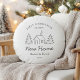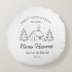 Una almohada redonda cómoda y neutra con un minimalista ilustracion de pino y casa de invierno y el titular en arco "Primera Navidad en nuestro nuevo hogar". Personalice los nombres y el año con un cálido acento casero que funcione con cualquier decoración, desde la moderna hasta la casa de campo. Perfecto en el sofá, en el banco de entrada o en la habitación, y un encantador regalo de bienvenida o de vacaciones para los nuevos propietarios.