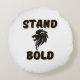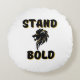 Esta almohada redonda tiene un diseño que muestra las palabras "Stand Bold" en un tipo de letra negrita con letra negra sobre una sombra de color dorado con un ícono de cabeza de león negro y dorado en el centro en este tema de cita de la biblia basado en la fe. Esta almohada está hecha con tela de alta calidad nuestras almohadas son suaves y sin arrugas la cubierta es lavable por máquina.