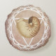 Una cáscara de nautilus detallada se sienta en el centro de una intrincada mandala geométrica blanca, fijada sobre un fondo naranja rojo texturado. Los delicados patrones y tonos crean una sensación de equilibrio y armonía.