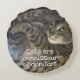 Un bonito y único gato de cuadros grises enrollado pintado sobre la piedra. El gato humorístico cita a ambos lados, "No Cat No Life" y "Los gatos son conocedores del confort".