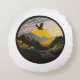 A sticker with an eagle flying over a mountain, in the style of contemporary landscape, golden light, black mountain college, fisheye lens, arts and crafts movement, mid-century illustration