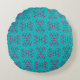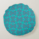 A bold, retro-inspired round pillow featuring a teal and hot-pink geometric pattern.