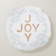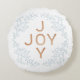 Bello y elegante diseño de almohadas redondas con "JOY" escrito en grandes letras en negrita sobre un fondo blanco con polvorientos elementos botánicos azules.