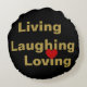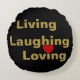 Inspiradora almohada de tiro negro y dorado "Viviendo, riéndose y amando". El cliente puede cambiar el color de fondo negro. El corazón rojo está frente al corazón dorado. Se puede elegir el que se debe conservar en el diseño. Por https://www.zazzle.com/store/celestesheffey