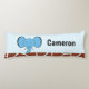 almohada elefante de ilustracion corporal personalizada con un nombre. La parte posterior de esta almohada está llena de dibujo de la cabeza del elefante. Fondo azul y jirafa.