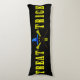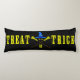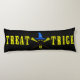 Dibujo del gorra de un mago azul, decorado con estrellas amarillas y dos escobas de brujas cruzadas bajo el gorra. Ojos amarillos demoníacos entre el gorra y las escobas y un texto Trata o truco. Divertido tema de Halloween. Come, bebe y da miedo. Productos y souvenirs Panorámicos.