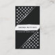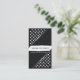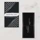 Colas metálicas plateadas y rayas diagonales de tarjetas de visita blancas negras, con dos triángulos cubiertos con clavos metálicos en dos esquinas de la tarjeta, rayas plateadas diagonales y una banda blanca en el centro con tu nombre. Fondo negro.