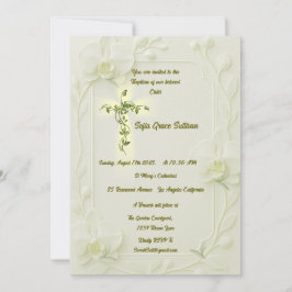 Celebrate a sacred moment with this elegant AI-generated baptism invitation template, featuring a delicate embossed white orchid floral frame and a glowing vine cross in soft green and gold tones. This timeless design is perfect for baptisms,