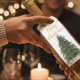 Agregue su breve saludo navideño y el nombre de su familia a esta etiqueta colgante de botella de árbol de Navidad festivo.