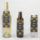 Etiquetas para botellas de eventos con un patrón elegante y sofisticado. Hermosas margaritas amarillas y hojas verdes rodeadas de delicadas cadenas doradas. Fondo negro.