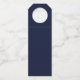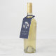 Estas etiquetas colgantes para botellas de boda elegantes y modernas presentan una hermosa corona con flores acuarelas de colores náuticos sobre un fondo oscuro de azul marino. Las flores de hortensia, peonía y anemona aparecen en tonos de azul marino, azul claro y rosa suave con hojas verdes y beige neutro, y tu monograma o inicial en el centro.