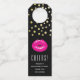 Etiquetas personalizadas con un ilustracion con labios rosados calientes. Imagen audaz y vibrante. Relieve metalizado de oro falso confeti a lo largo de la parte superior. Fijado sobre un fondo negro.