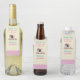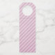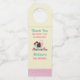 Un cumpleaños gracias a tu percha de botellas de vino. Un patrón diagonal rayado rosado a lo largo del borde inferior. Ilustrado con una barra de helado de chocolate, un sundae de 3 cucharas con una cereza sobre la mesa y un flotador de fresa con crema batida. Fresas y cerezas. Fondo amarillo pálido.