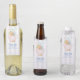 Gracias etiquetas de botella por tu evento. Diseñado con un ilustracion caprichoso. Una tetera rosa con un pequeño corazón rosado en el centro y un ramo de flores en el interior. Delicadas mariposas de colores pastel revolotean por todas partes. Sobre un fondo rayado gris y blanco.