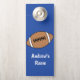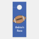 Un perchero azul de la puerta de fútbol, que se puede personalizar fácilmente con su nombre. ¡Genial para una habitación para niños! La parte de atrás de esta percha de fútbol tiene un montón de balones de fútbol contra un fondo azul.