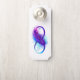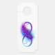 Símbolo infinito con una hermosa pluma pintada de color violeta y azul brillante sobre fondo blanco.