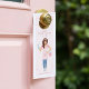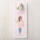 Diseños modernos y profesionales de limpieza de casa de referencia para el perchero de la puerta con una hermosa, sonriente y amigable mujer con una mano en la cadera, sosteniendo un cubo de agua de jabón, y la otra mano sosteniendo una botella de pulverizador de limpieza. La dama está vestida con un delantal tiraizado rosa y lindo, una camisa rosa y lustre, y vaqueros vaqueros. El reverso está diseñado en un estilo limpio y minimalista con algunos materiales de limpieza. Personalizado con sus datos de referencia, sitio web y manejo social. Una simple moda y un elegante perchero de puerta para los servicios de limpieza de la casa de las sirvientas, y mucho más. Todas las obras de arte originales de Moodthology Papery.