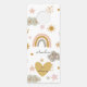 ¡El clima de arco iris boho pintado a mano por Little Girl significa que hay cielos brillantes por delante! Arcos de lluvia, soles, estrellas, nubes y gotas de lluvia, dulces y coloridos. Personalizado dentro de un corazón de paz con nombre. La paleta de tonos tierra está a la moda en un espacio de dormitorio acogedor. Revertir al rostro de la princesa "Buenos días"