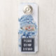 Por favor, no molesten el colgador de la puerta con una linda fotografía de un pequeño muñeco de nieve. Fuera en invierno con nieve cayendo por todas partes. Este chico lindo está vestido con gorra de punto azul y bufanda.
