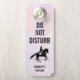 Percha de puerta con un ilustracion blanco y negro de un jinete de ropa. El caballo y el jinete están tocando una pirueta. Elegante y hermoso. Colocado en un fondo acuático de colores pastel delicados y mullidos. El texto dice No molestar, con un nombre personalizado.