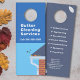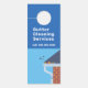 Percha de puerta de dos tonos azules con un ilustracion de techo y alcantarilla de una casa y algunas hojas de otoño. Podría utilizarse para pequeñas empresas, como limpieza o reparación de tejados y alcantarillas, remoción de musgos, mano de mano, servicio de lavado a presión, etc.