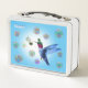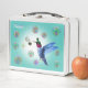 Cute colibrí y burbujas de jabón en la verde azulada y clara caja de almuerzo azul.