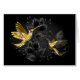 Colibríes con joyas negras y doradas sobre un fondo gris adornado con plantas. Aves de joyas. Ave dorada. Ave dorada.
